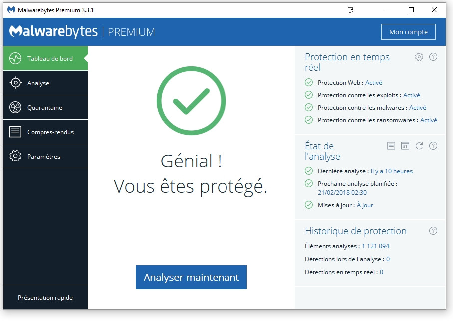 Malwarebytes Premium intègre plusieurs modules d'analyse comportementale et heuristique de dernière génération, ainsi qu'un scan de correspondance de signatures de virus équivalent à ceux utilisés par les antivirus traditionnels. Ultraléger et réactif, le logiciel est également reconnu pour ses puissants outils de remédiation (technologie de désinfection des charges malveillantes). Une solution moderne qui s'impose désormais comme une alternative des plus convaincantes aux antivirus traditionnels.