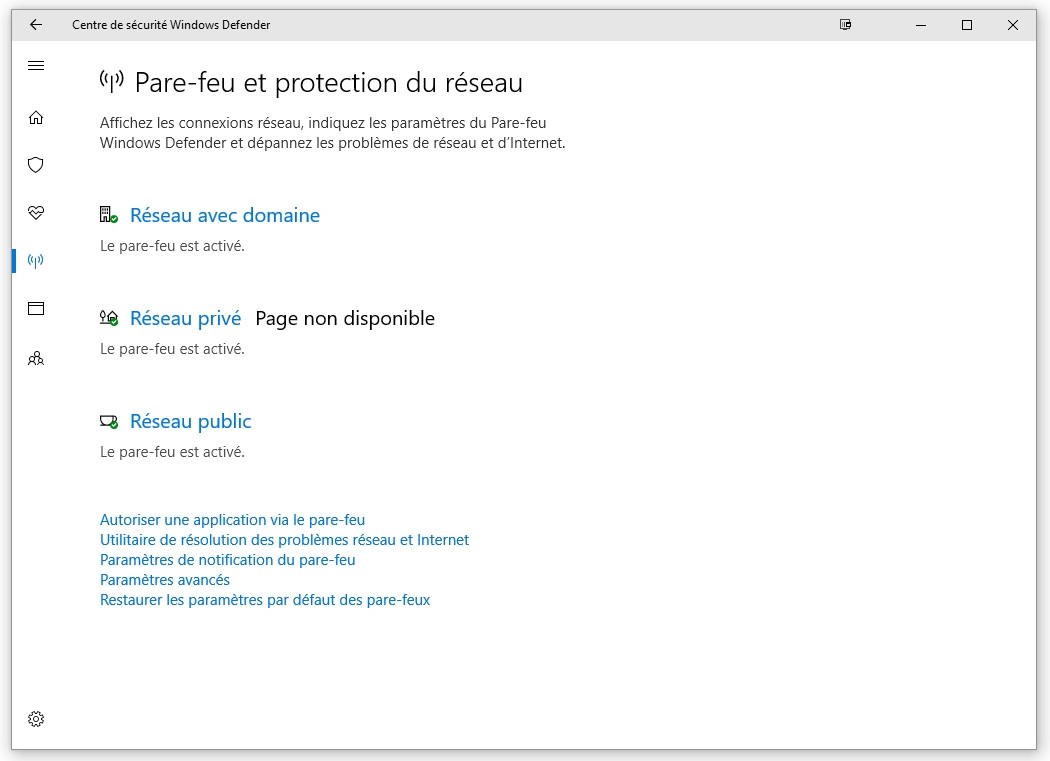 Le pare-feu (ou firewall en anglais) demeure encore souvent l'apanage des suites payantes. Son rôle est de contrôler toutes les connexions entre les réseaux et votre ordinateur et de bloquer les communications qui représentent une menace. Complémentaire d'un antivirus, il peut dans certains cas empêcher un malware ou un trojan non détecté de communiquer vers l'extérieur et de transférer des données subtilisées.Certains antivirus comme Avira affichent un pare-feu, mais ils se contentent en réalité de prendre la main sur celui intégré nativement à Windows, sans offrir de fonctions avancées. Le centre de sécuritéWindows Defender intègre une interface dédiée aux réglages du pare-feu.